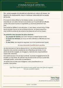 Moi, artiste engagée et profondément attachée aux valeurs de respect, de dignité et de responsabilité, tiens à m’adresser solennellement au peuple de Guinée.