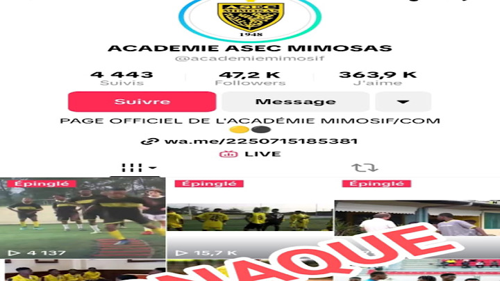 « Soyez vigilants ! Sur le réseau social TikTok, plusieurs faux comptes se font passer pour des pages officielles de l’Asec Mimosas, prétendant représenter la cellule de recrutement du club. C’est de l’arnaque ! », a averti le club, dénonçant une escroquerie bien organisée. Selon les explications fournies, ces individus réclament de l’argent aux candidats sous prétexte de leur permettre d’intégrer l’Académie MimoSifcom.